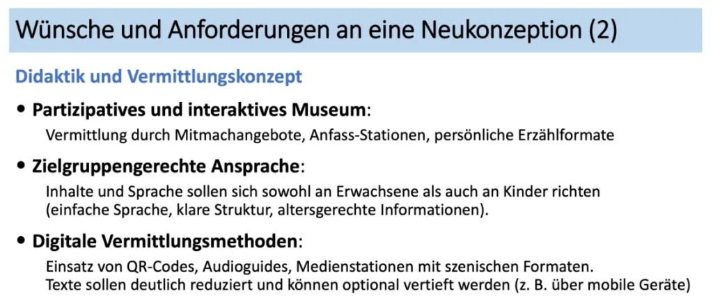 Die Ausstellung wird interaktiver und partizipativer: Mitmach-Stationen, Anfass-Angebote und persönliche Erzählformate sollen den Museumsbesuch zu einem Erlebnis machen. Digitale Vermittlungsmethoden wie QR-Codes, Audioguides und Medienstationen ergänzen das Angebot. Texte werden deutlich reduziert und können optional über mobile Geräte vertieft werden. Die Inhalte richten sich dabei sowohl an Erwachsene als auch an Kinder – mit einfacher Sprache, klarer Struktur und altersgerechten Informationen.